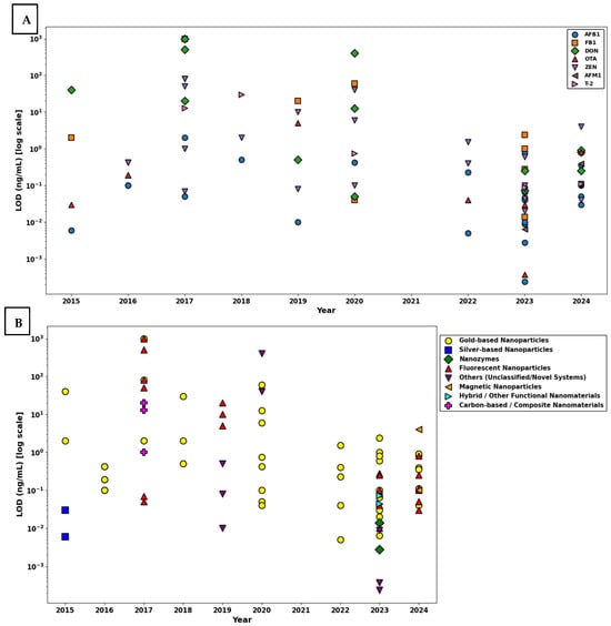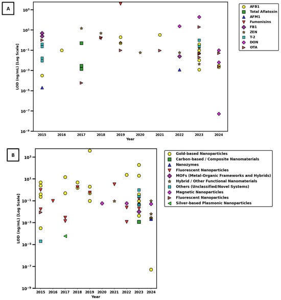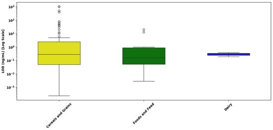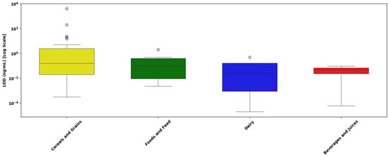 - Cereal and grain matrices exhibited the widest range of LOD values, with values spanning from 10−4 ng/mL to over 101 ng/mL, and a median near 10−1 ng/mL. A large number of high-value outliers were observed, some extending close to 103 ng/mL, indicating substantial variability in assay sensitivity.