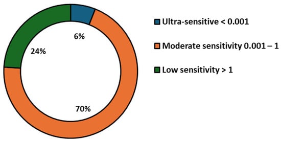 - Foods and Feed: The LOD values in foods and feed range from roughly 10−3 ng/mL up to just above 1 ng/mL. The median value is close to 10−1 ng/mL, indicative of relatively consistent detection performance across these matrices. Few outliers at the higher concentration end highlight moderate variability, likely influenced by assay or matrix-specific differences.