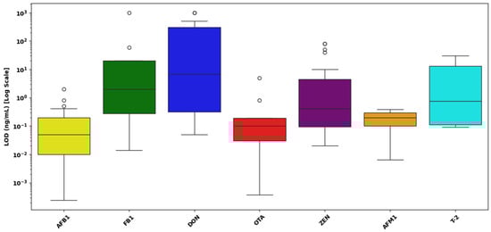 - Fumonisins: This group exhibits the broadest range, with LOD values extending from slightly above 100 ng/mL up to nearly 103 ng/mL, indicating significantly lower sensitivity compared to other mycotoxins. The median is notably elevated, positioned around 102 ng/mL, emphasizing substantial analytical difficulty in achieving low detection limits.