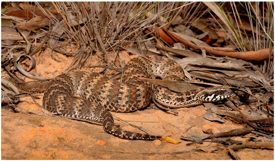 - Shine, R. Ecology of the Australian Death Adder Acanthophis antarcticus (Elapidae): Evidence for Convergence with the Viperidae. Herpetologica 1980, 36, 281–289. [Google Scholar]