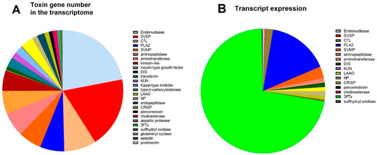(A). The number of toxin genes in the venom gland transcriptome of A. antarcticus. (B). Toxin gene expression in the venom gland transcriptome (counts per million—CPM).