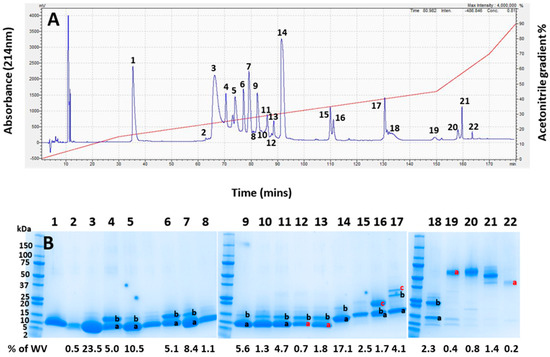 Pooled whole A. antarcticus venom was first fractionated using RP-HPLC, revealing 22 prominent elution peaks, (Figure 3A). The visualisation of the venom fractions by gel electrophoresis (Figure 3B) showed that the majority of the venom, as indicated in peaks 1–15 (making up approximately 90% of the venom), were composed of low-molecular-weight proteins in a mass range of 5 to 20 kDa. The lane between lanes 5 and 6 was taken from the trough between those peaks and so is unnumbered. The only protein positively identified in Peak 1 was a ribosomal protein impurity, so this peak was excluded from peak integrations for calculating toxin abundance (see Supplementary File S2).