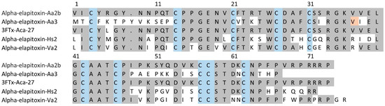 Amino acid sequences for the two long-chain 3FTxs alpha-elapitoxin-Aa2b (59%) and alpha-elapitoxin-Aa3 (0.8%) in A. antarcticus (first and second row), compared to 3FTx-Aca-27 from A. wellsii, alpha-elapitoxin-Hs2 from Hoplocephalus stephensii, and alpha-elapitoxin-Va2 from Vermicella annulata. The conserved cysteine residues are shaded in blue and shaded areas indicate the same residue compared to alpha-elapitoxin-Aa2b. The orange-shaded residue 37 is valine or glycine for the two proteoforms of this toxin.