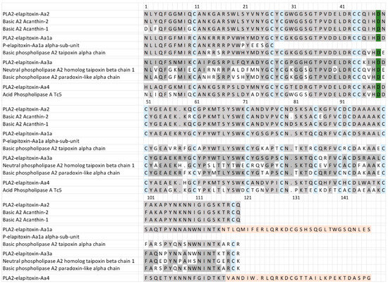PLA2 was the second most abundant protein family expressed in the venom of A. antarcticus, consisting of four toxins and making up a total of 22.5% of the venom. The predominant PLA2 toxin made up almost 16% of the whole venom, and its amino acid sequence matched very closely to two previously identified toxins, Acanthin-1 and Acanthin-2, which are potent platelet inhibitors [45]. The similarity between Acanthin-1, Acanthin-2 and the amino acid sequence here suggests that they are, in fact, one toxin with a number of proteoforms, varying by 3 to 6 amino acids, which we suggest should be renamed PLA2a-elapitoxin-Aa2 (Figure 6). This toxin has not been shown to be neurotoxic, and it does not appear to match any previously identified subunits of pre-synaptic neurotoxins.