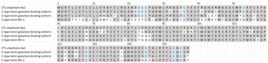 The amino acid sequence deduced for a newly identified toxin CTL-elapitoxin-Aa1 (row 1; 3.6%) in A. antarcticus venom compared to the C-type lectin galactose-binding isoform (row 2; D2YVK1) in Hoplocephalus stephensii venom, the C-type lectin galactose-binding isoform (row 3; D2YVI2) in Pseudechis australis venom, and the C-type lectin BfL-1 (row 4; Q90WI8) from Bungarus fasciatus venom. The conserved cysteine residues are shaded in blue; and shaded grey areas indicate the same residue compared to CTL-elapitoxin-Aa1.