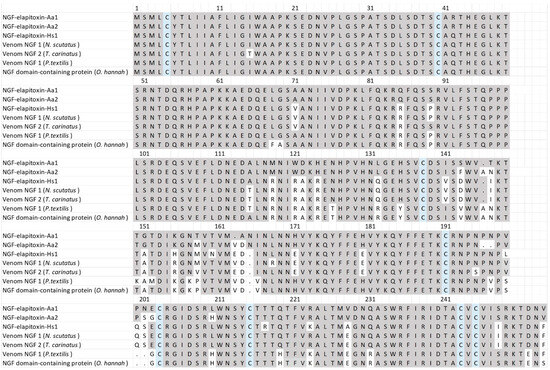 The amino acid sequences deduced for two new NGFs, NGF-elapitoxin-Aa1 and NGF-elapitoxin-Aa2 (rows 1 and 2), compared to five different NGFs previously identified in Hoplocephalus stephensii venom (row 3), Notechis scutatus (Q3HXY7; row 4), Tropidechis carinatus (Q3HXX7; row 5), Pseudonaja textilis (Q3HXY9; row 6) and Ophiophagus hannah (V8NP13; row 7). Conserved cysteine residues are shaded in blue and shaded areas indicate the same residue compared to NGF-elapitoxin-Aa1.