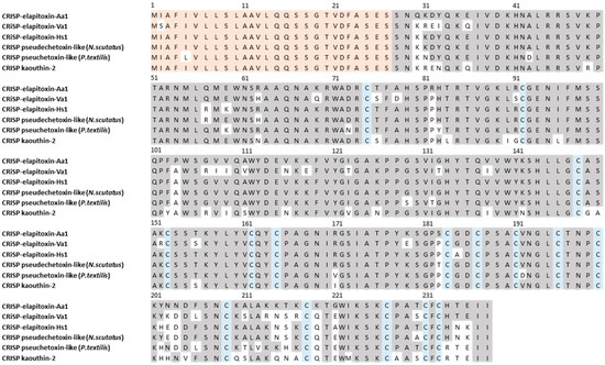 There were five different assemblies for CRiSP in our transcriptome which matched our MS/MS-identified peptide fragments. The sequence alignments of these assemblies showed that they consisted of a single CRiSP toxin named CRISP-elapitoxin-Aa1 (Figure 10).
