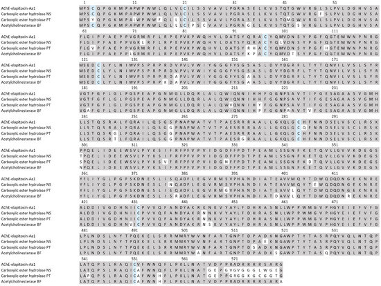 The amino acid sequence deduced for a new acetylcholinesterase AChE-elapitoxin-Aa1 (row 1) compared to acetylcholinesterases found in the venoms of Notechis scutatus (carboxylic ester hydrolase; A0A6J1W3U1; row 2), Pseudonaja textilis (carboxylic ester hydrolase; A0A670ZA06; row 3), and Bungarus fasciatus (acetylcholinesterase; Q92035; row 6). The conserved cysteine residues are shaded in blue and grey-shaded areas indicate the same residue compared to AChE-toxin-Hs1.