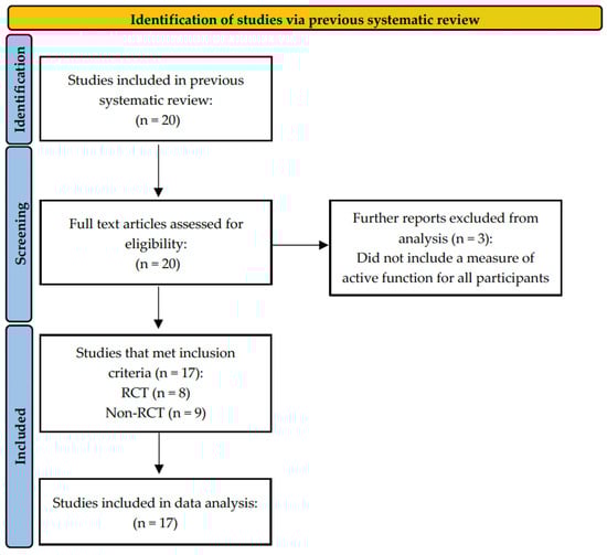 Figure 1 demonstrates the Preferred Reporting Items for Systematic Reviews and Meta-Analyses (PRISMA) flow diagram of study identification []. This flow diagram has been modified to reflect that this review was a further analysis of a systematic review by Gill et al. []. A total of 20 studies were included in the data analysis of Gill et al. [] and therefore screened for eligibility against the inclusion criteria of the present study. After screening, 17 studies [,,,,,,,,,,,,,,,,] met this review’s inclusion criteria (Figure 1). Three studies were excluded because they did not include a measure of active function for all participants [,,].