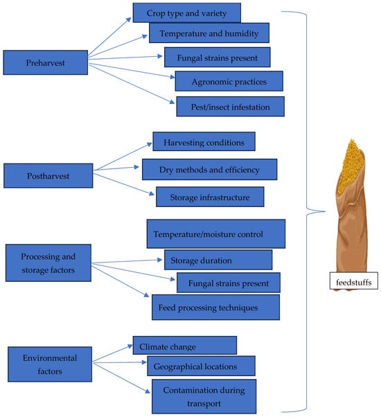 Lastly, the association between fungal species and specific cereals significantly influences the distribution of mycotoxins. For instance, F. verticillioides, a well-known fumonisin producer, frequently infects maize. Similarly, F. culmorum and F. graminearum, producers of DON and ZEN, are commonly found in maize, wheat, barley, and rice [63]. Figure 1 depicts a summary of the factors that influence mycotoxin distribution in feeds and feedstuffs.