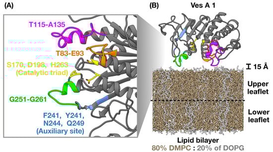 - Pattaranggoon, N.C.; Daduang, S.; Rungrotmongkol, T.; Teajaroen, W.; Tipmanee, V.; Hannongbua, S. Computational model for lipid binding regions in phospholipase (Ves a 1) from Vespa venom. Sci. Rep. 2023, 13, 10652. [Google Scholar] [CrossRef] [PubMed]