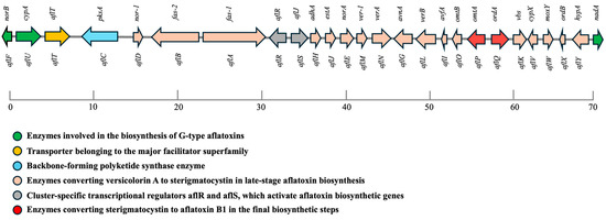 Aflatoxins are synthesized via a highly coordinated polyketide-derived biosynthetic pathway involving over two dozen enzymatic transformations [2,26,27,28,29]. The genes responsible for aflatoxin biosynthesis are clustered within a ~70-kilobase region near the telomeric end of chromosome 3 (Figure 1). This cluster includes about 30 co-regulated genes, designated with the prefix “afl”, ranging from aflA to aflY [2,26,30]. These genes encode enzymes responsible for specific transformations in the biosynthetic pathway. The pathway begins with the polymerization of acetate units into a polyketide backbone, followed by successive steps that yield intermediates such as norsolorinic acid (NOR), averantin (AVN), 5′-hydroxyaverantin (HAVN), oxoaverantin (OAVN), averufin (AVF), hydroxyversicolorone (HVN), versiconal hemiacetal acetate (VHA), versiconol acetate (VOAc), versiconal (VOH), versicolorin B (VERB), versicolorin A (VERA), demethylsterigmatocystin (DMST), sterigmatocystin (ST), O-methylsterigmatocystin (OMST), and 11-hydroxy-OMST, before culminating in AFB1 [28].