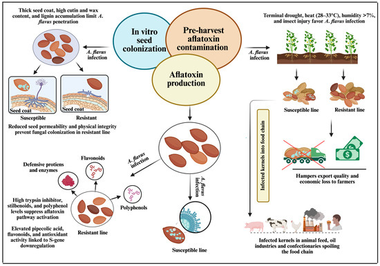 Aspergillus flavus is a fungal pathogen and the primary source of aflatoxin contamination in a wide range of crops, posing a constant threat to food safety and crop productivity worldwide [1]. Due to its lack of host specificity, A. flavus infects numerous plant species, but its impact is particularly severe in peanuts [2,3,4,5,6]. The fungus thrives in hot climates and becomes especially problematic in regions where peanuts are exposed to high temperatures, drought, and insect damage. These stressors not only weaken plant defenses but also create physical entry points that facilitate fungal invasion and aflatoxin production [7,8,9,10]. Following entry through wounds, A. flavus can penetrate the shell and seed coat and establish within the cotyledon, often resulting in reduced germination and seedling vigor [11]. The pathogen persists in infected plant debris such as conidia, sclerotia, or mycelia, enabling survival between growing seasons [12]. Under favorable conditions, sclerotia start germinating and lead to the production of mycelia and conidiophores [13,14]. These structures generate conidia, which can spread via air currents, water splashes, or insect vectors. Insects such as Helicoverpa armigera and Caryedon serratus play a significant role in dispersal and infection by creating entry points in plant tissues or directly transporting spores [15].