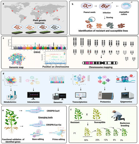 Integrated pipeline for developing aflatoxin-resistant peanut cultivars. (a) Strategic collection of genetically diverse germplasm, including wild relatives, landraces, and elite lines from global locations to capture natural variation in resistance traits. (b) Artificial inoculation of seeds with Aspergillus flavus under controlled conditions, followed by phenotypic screening for resistance through fungal colonization and aflatoxin quantification. (c) Integration of phenotypic data using genome-wide association studies (GWAS) and quantitative trait loci (QTL) mapping to identify key loci. (d) Deployment of multi-omics platforms, including genomics, transcriptomics, proteomics, metabolomics, epigenomics, and interactomics to unravel resistance mechanisms and prioritize candidate genes. (e) Functional validation of candidate genes using advanced genome editing technologies. While CRISPR/Cas9 has been successfully applied in peanut, other systems such as Cas12a, base editors, and prime editors are considered promising tools but remain to be experimentally validated in this crop. (f) Introgression of validated resistance alleles or edited loci into elite cultivars using marker-assisted backcrossing and genomic selection to develop high-performing, aflatoxin-resistant lines.