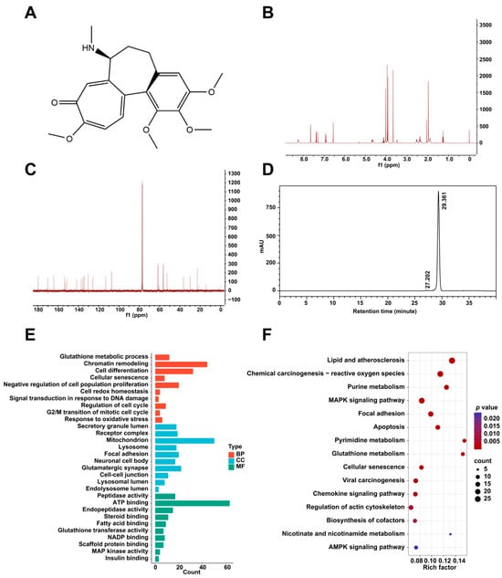 (A) The chemical structure of colchicine. (B) 1H NMR and (C) 13C NMR spectra of colchicine recorded at 400 MHz. (D) HPLC analysis of colchicine purity. (E) GO and (F) KEGG pathway enrichment analyses of potential target proteins of colchicine derived from the PharmMapper database.