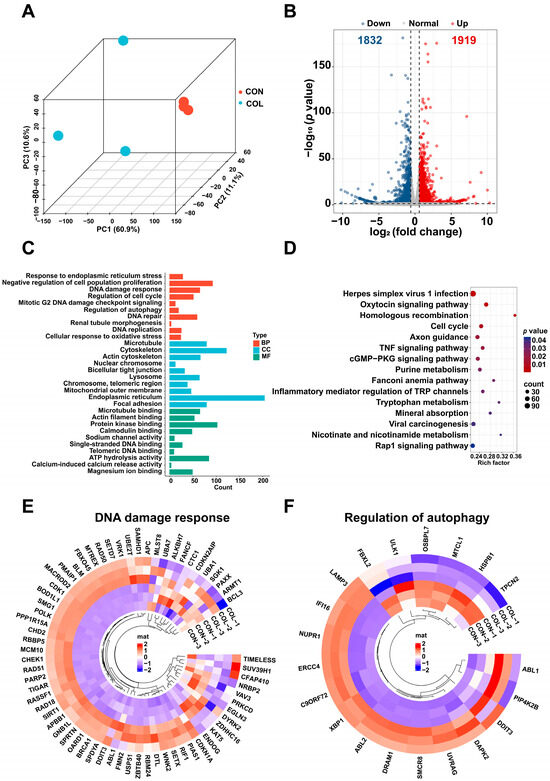 To elucidate the molecular mechanisms of colchicine-induced renal cell injury, an mRNA-seq analysis was performed on HK2 cells exposed to 5 nM colchicine for 72 h. A principal component analysis (PCA) demonstrated clear separation between the colchicine-treated and control groups (Figure 3A). A total of 3751 DEGs were identified based on the thresholds of p < 0.05 and |log2(fold change)| > 0.585, comprising 1919 upregulated and 1832 downregulated genes (Figure 3B). The DAVID database was used to perform GO and KEGG pathway enrichment analyses for the functional annotation of DEGs. The GO enrichment results mainly included DNA damage response, cellular response to oxidative stress, DNA repair, regulation of autophagy, and lysosome (Figure 3C). Meanwhile, the KEGG enrichment results mainly included cell cycle, homologous recombination, and purine metabolism (Figure 3D). A circular heatmap representation further revealed alterations in the expression of genes associated with DNA damage response and the regulation of autophagy (Figure 3E,F).