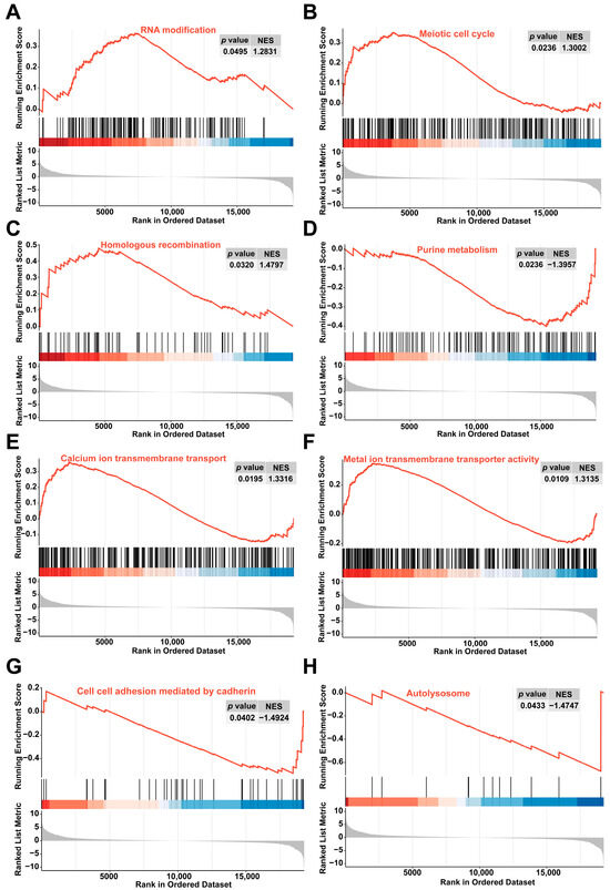 GSEA revealed enrichment in pathways related to (A) RNA modification, (B) meiotic cell cycle, (C) homologous recombination, (D) purine metabolism, (E) calcium ion transmembrane transport, (F) metal ion transmembrane transporter activity, (G) cell–cell adhesion mediated by cadherin, and (H) autolysosome.