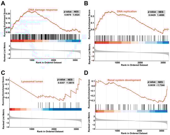 GSEA revealed enrichment in the (A) DNA damage response, (B) DNA replication pathways, (C) lysosomal lumen, and (D) renal system development pathways.