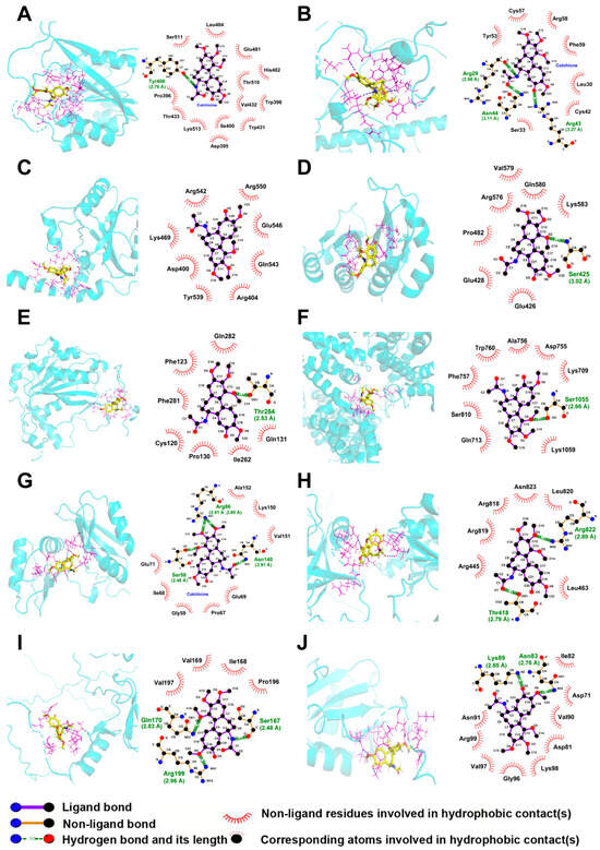 Three-dimensional and two-dimensional molecular docking models illustrated the interactions between colchicine and differentially expressed m6A regulators, including (A) METTL3, (B) ZC3H13, (C) YTHDF1, (D) IGF2BP2, (E) METTL14, (F) VIRMA, (G) IGF2BP3, (H) RBM15B, (I) CBLL1, and (J) HNRNPC.