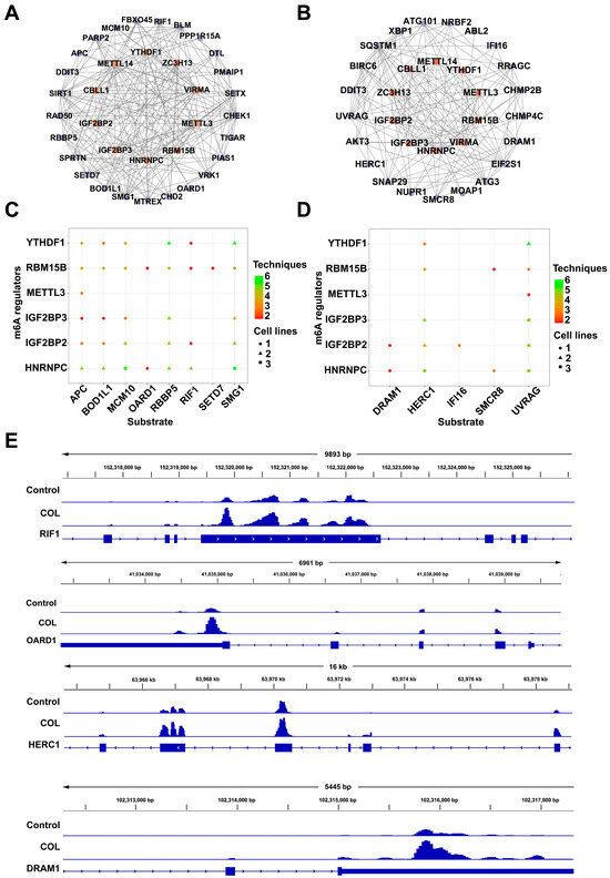 Interaction networks linking m6A regulators with (A) DNA damage response genes and (B) autophagy-related genes. Substrate prediction for the m6A regulators based on genes from (C) DNA damage response and (D) autophagy-related pathways. (E) Levels of m6A modification on RIF1, OARD1, HERC1, and DRAM1 as observed via IGV.