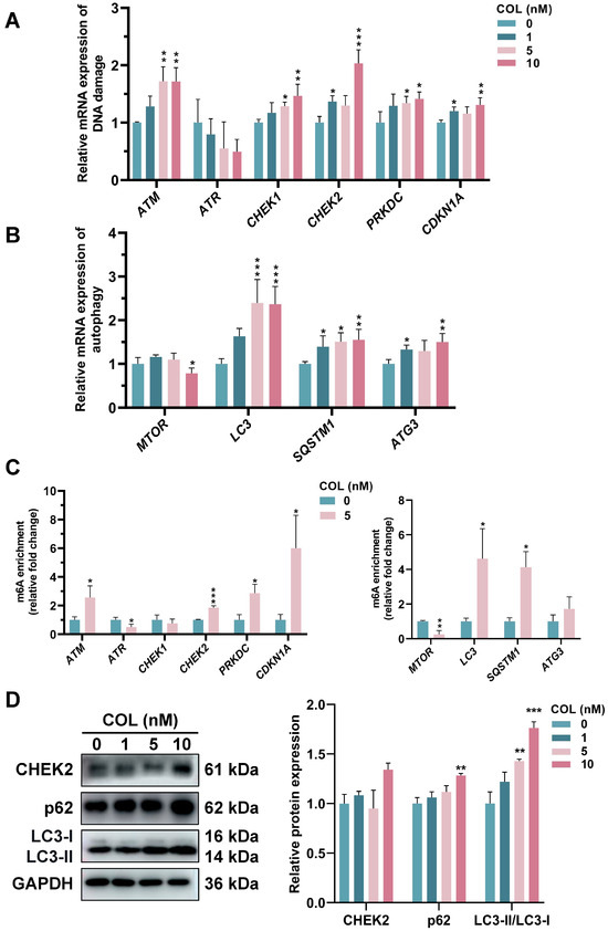 The mRNA expression levels associated with DNA damage and autophagy in the HK2 cells after colchicine treatment are presented in Figure 12A,B. In the genes associated with DNA damage, the expression levels of ATM, CHEK1, CHEK2, PRKDC, and CDKN1A were significantly elevated. Treatment with 10 nM colchicine resulted in a 1.7-fold increase in ATM expression and a 2.0-fold increase in CHEK2 expression compared with those in the control group. Among the autophagy-related genes, MTOR was downregulated, while LC3, SQSTM1 and ATG3 were upregulated. Treatment with 10 nM colchicine resulted in a 2.4-fold upregulation of the autophagy marker LC3 compared with that in the control. Moreover, MeRIP-qPCR showed altered m6A modification levels in these genes (Figure 12C). A Western blot analysis demonstrated colchicine-induced DNA damage due to the increase in CHEK2 in the 10 nM treatment group compared to controls. LC3-II/LC3-I, an indicator of autophagosome biogenesis, exhibited a dose-dependent increase, with a fold change of 1.76 in 10 nM treatment group, with a 28.2% upregulation in p62 levels compared with that in the control group (Figure 12D). An increase in the LC3-II/LC3-I ratio, along with an increase in p62 expression, indicated colchicine might impair autophagy flux by blocking autophagosome–lysosome fusion or lysosomal degradation, leading to the accumulation of LC3-II and p62.