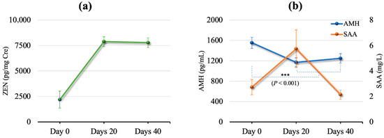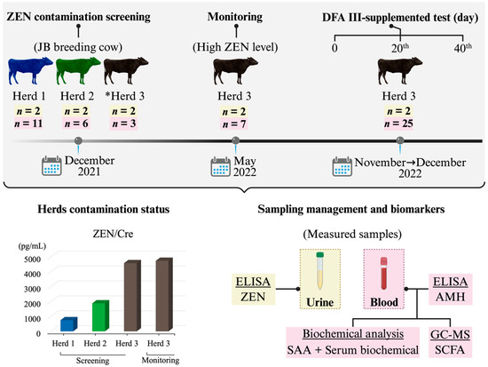- Widodo, O.S.; Pambudi, D.; Etoh, M.; Kokushi, E.; Uno, S.; Yamato, O.; Taniguchi, M.; Lamid, M.; Takagi, M. Practical application of a urinary zearalenone monitoring system for feed hygiene management of a Japanese black cattle breeding herd-relevance to anti-Müllerian hormone and serum amyloid A clarified from a two-year survey. Toxins 2023, 15, 317. [Google Scholar] [CrossRef]
