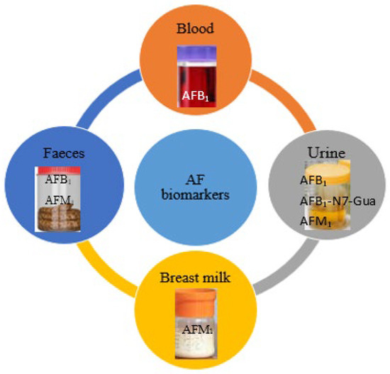 Understanding the sources of AF exposure and their metabolic pathways is essential for the advancement of appropriate biomarkers for exposure estimation. Furthermore, the effective use of biomarkers necessitates the availability of detailed information regarding individual AF toxicokinetics, bioavailability, and metabolism to accurately interpret the results [120]. Human data on toxicokinetic studies for various toxins are limited, as most studies have predominantly been conducted in animal models; consequently, exposure assessment using biomarkers presents a quantitative approach fraught with significant uncertainties [121]. Biomonitoring includes the detection of AFs in readily accessible biological liquids like blood, milk, feces, and urine (see Figure 2). The main benefit of these biomarkers rests in their capacity to assess AF exposure levels within biological matrices, which integrate all previously identified sources of [122,123]. The detection of biomarkers can be conducted using one of the following approaches: direct biomarkers, which involve the application of particular standardized methods that are refined and confirmed methods utilizing parent compounds as reference substances [124], indirect biomarker quantification, which entails assessing non-specific structural or functional alterations in the body induced by exposure to certain drugs or toxins; or non-targeted biomarkers, which involve the measurement of unknown aflatoxin derivatives.