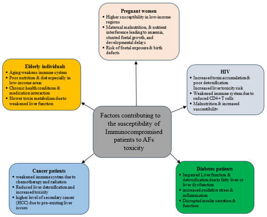 However, these measures have not been able to combat the increased risks to immunocompromised individuals. Despite the globally recognized health risk posed by AF, there has been limited research focused on monitoring AF exposure in humans, let alone in immunocompromised individuals [36]. This gap emphasizes the need for targeted studies and interventions to address the particular risks to immunocompromised individuals. Therefore, this review provides a detailed overview of AF exposure in immunocompromised populations, including people with cancer, hepatitis, diabetes, malnutrition, pregnant women, and the elderly. It also provides a thorough and detailed examination of the various pathways of AF exposure in these vulnerable populations, including ingestion, carriage from animal products, in utero and maternal transmission, and inhalation. The review also looks in detail at the commonly used matrices and biomarkers for AF detection and explores the impacts of AF exposure on diseases such as diabetes, hepatitis, HIV, and cancer. Particular emphasis is placed on the increased susceptibility of vulnerable populations, including the elderly, pregnant women, malnourished individuals, and patients with HIV, diabetes, hepatitis, or cancer, who are at increased risk of AF-induced toxicity due to their weakened immune systems. More importantly, the review highlights future perspectives and emphasizes the need for targeted interventions, advanced diagnostic tools, and policy frameworks to reduce the health impact of AFs in this high-risk group. By bridging the existing knowledge gaps, this study aims to inform research priorities and public health initiatives and ensure the development of tailored approaches to safeguard the health of immunocompromised individuals in the face of this persistent threat.