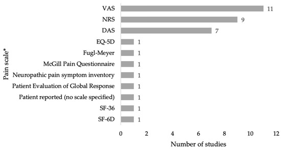 All studies that reported a pain outcome were included, regardless of the scale used. The VAS, NRS, and DAS were the most commonly used instruments in eleven, nine, and seven studies, respectively. Six additional pain scales (EQ-5D, SF-36, SF-6D, the McGill pain questionnaire [MPQ], Neuropathic Pain Symptom Inventory [NPSI], and Fugl-Meyer) were identified, but these were used infrequently.
