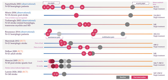 Change in visual analog scale from baseline following treatment with onabotA [14,41,49,50,54,56,60,65,66]. Please note this is a visual representation of the data and is not to scale; for the full dataset, please see Supplementary Materials Table S4. The numbers in circles indicate the weeks of follow-up, with grey circles indicating baseline score and red circles indicating post-onabotA treatment. In Mancini 2005, darker shading indicates higher dose. Scales represent either 0–10 or 0–100 (no pain to worst pain). HTM, hemiplegia transverse myelitis; MS, multiple sclerosis; NR, not reported; RCT, randomized controlled trial; SCI, spinal cord injury; U, units.