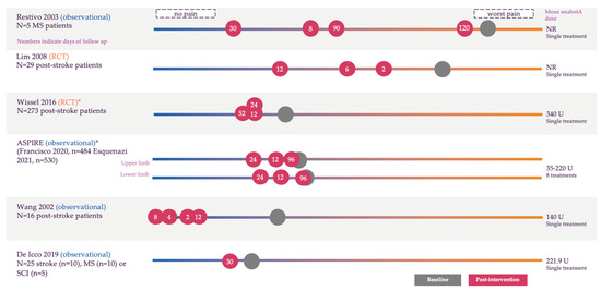 Change in numerical rating scale from baseline following treatment with onabotA [42,44,45,52,58,67,69]. Please note this is a visual representation of the data and is not to scale; for the full dataset, please see Supplementary Materials Table S5. The numbers in circles indicate the weeks of follow-up, with grey circles indicating baseline score and red circles indicating post-onabotA treatment. Numbers in the circles indicate the weeks of follow-up. Scales were 0–3 [58] or 0–10 (all other studies). ASPIRE, Adult SPasticity International Registry; MS, multiple sclerosis; NR, not reported; RCT, randomized controlled trial; SCI, spinal cord injury; U, units. * Post-treatment values were calculated based on average reduction.