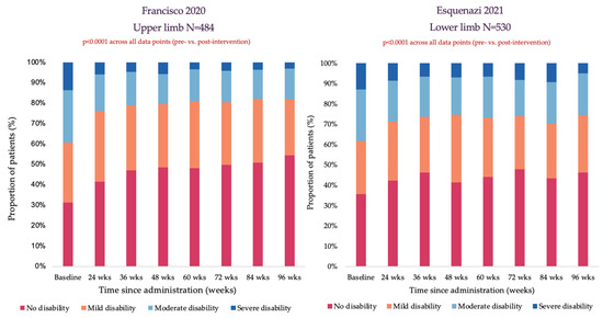 The ASPIRE study, a multicenter, prospective, observational study, assessed the real-world utilization of onabotA and its impact on spasticity-associated pain. As well as using an 11-point NRS, pain was assessed using the DAS, where patients were evaluated by clinicians over a follow-up period of 96 weeks. Study results describing pain outcomes were reported in two different publications in this systematic review. Francisco et al. 2020 reported results in patients with upper limb spasticity (n = 484) [45], and Esquenazi et al. 2021 reported results in patients with lower limb spasticity (n = 530, Figure 5) [44]. A similar trend of decreased severe pain-related disability and increased reporting of no disability was observed in both publications across the study period. Furthermore, both publications reported a significant reduction in patient-reported spasticity-related pain evaluated with NRS (as reported in 4.2.2).