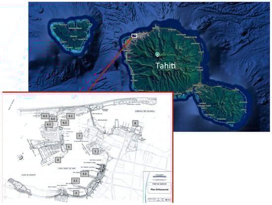 Map of Tahiti Island showing Papeete port. Modified from Google (n.d.). Retrieved on 28 June 2025. The location of the sampling points is shown in the map of the port (shown above on the left). The numbers (1, 2, 3.1, 3.2, 4, 5, 6.1 to 6.5, 7, 8) are the codes of the sampling points.