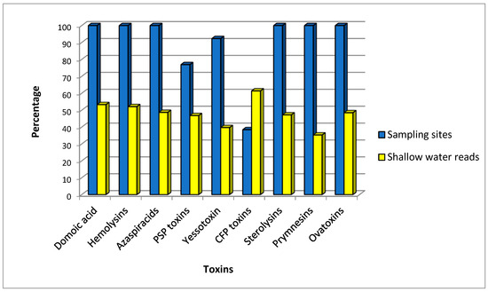Many species were detected across all the sampling locations, whereas Amphidinium carterae and Gambierdiscus carpenteri were less frequent, each found only from at only a single location. Three species (Margalefidinium fulvescens, Margalefidinium polykrikoides, and Tripos fusus) are known to be associated with fish mortality events but not with specific toxicogenic activity [17,18,19]. The remaining species are well-documented toxin producers [17]. Those of the genus Pseudo-nitzschia produce domoic acid; Akashiwo sanguinea, Amphidinium carterae, and Pheaocystis globosa, hemolytic toxins; Alexandrium affine, paralytic shellfish poisoning toxins; Amphidoma and Azadinium species, azaspiracids; Coolia canariensis and Protoceratium reticulatum, yessotoxins; Gambierdiscus species, maitotoxins and ciguatoxins (CFP toxins); Ostreopsis ovata, ovatoxins; Chrysochromulina leadbeateri, sterolysins; and Prymnesium polylepis, prymnesins (Table 2).