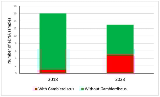 Number of eDNA samples from Papeete port with or without detected Gambierdiscus eDNA in 2018 [16] and 2023 (this study).