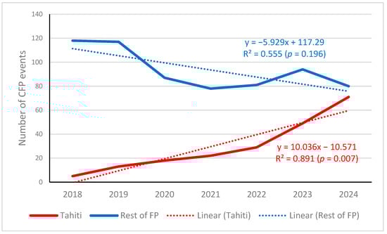 Number of ciguatera fish poisoning (CFP) events in Tahiti Island and in the rest of French Polynesia (FP) islands from 1 January 2018 to 31 December 2024. Graph generated by the authors using the data downloaded from the HAEDAT database for French Polynesia in the indicated period, filtering by Tahiti reports (red line) or without Tahiti (blue line).