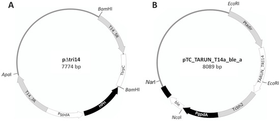 (A) Scheme of pΔtri14 plasmid. T14_5R and T14_3R are the regions located at the 5′ and 3′ sides of T. arundinaceum tri14 gene. PgpdA—promoter region of the Aspergillus nidulans glyceraldehyde-3-phosphate dehydrogenase; TtrpC—A. nidulans trpC terminator region; HPH—E. coli hygromycin B resistance gene. (B) Map of plasmid pTCS_TARUN_T14a_ble_a designed to express T. arundinaceum tri14 gene. ble—phleomycin/bleomycin resistance gene from Streptoalloteichus hindustanus. Ptadir indicates the promoter region of the Trichoderma harzianum tadir gene, and Tcbh2 indicates the transcriptional terminator of the T. reesei cellobiohydrolase 2 encoding gene.