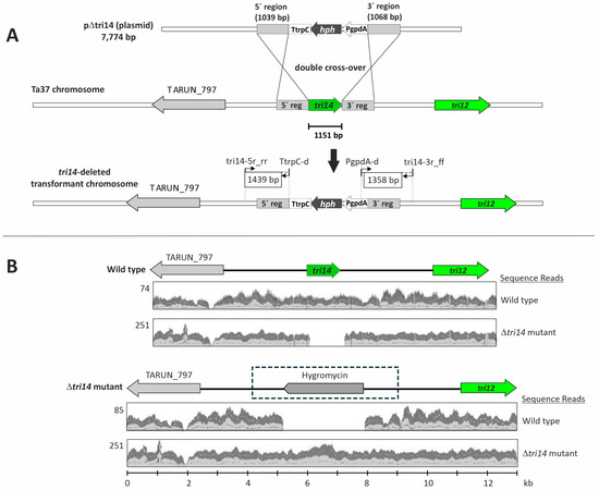 Transformation of T. arundinaceum protoplasts with plasmid pΔtri14 (Figure 1) resulted in the isolation of 12 stable transformants that retained their hygromycin-resistant phenotype after the selection process. These transformants were analyzed by PCR with oligonucleotides tri14_5R_rr/TtrpC-d and tri14_3r_ff/PgpdA-d, which were designed to amplify the 1439 bp and 1358 bp fragments corresponding to the 5′ and 3′ regions, respectively. These amplicons were expected to occur when the tri14 coding region was deleted as a result of double recombination between pΔtri14 and the tri14-flanking regions in T. arundinaceum. Only one transformant (mutant strain Δtri14.10) yielded the expected PCR amplicons (Figure S1), and it was selected for further studies. The nucleotide sequences of the two PCR amplicons from Δtri14.10 matched the sequences expected to result from the double recombination event (Figure 2). An analysis of the genome sequence of Δtri14.10 revealed that only one copy of the deletion cassette had integrated in the tri14 region but not at other genomic locations. Thus, both the PCR and genome sequence analyses indicate that the tri14 coding region was deleted in strain Δtri14.10 (Figure 2 and Figure S1).