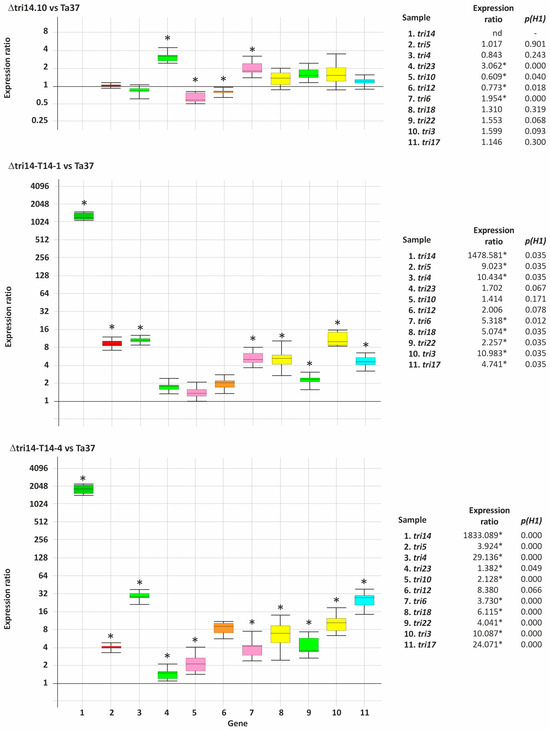 RT-qPCR analysis of tri gene expression levels in ∆tri14.10 (tri14 mutant), ∆tri14-T14.1 and ∆tri14-T14-4 (add-back tri14 mutants) compared to the reference strain Ta37 (wild type). Boxes are illustrated in different colors depending on the gene function. Red: terpene synthase (tri5); dark green: tri14; light green: monooxygenases (tri4, tri23 and tri22); pink: transcription factors (tri6 and tri10); brown: transporter (tri12); yellow: acyl/acetyltransferase (tri18 and tri3); blue: polyketide synthase (tri17). Expression ratios were calculated as described previously [27,28]. Transcription levels are ratios calculated relative to the wild-type strain (Ta37). Statistically significant values (p(H1) < 0.05) are indicated with an asterisk at the right of each panel and in the upper part of each graph.