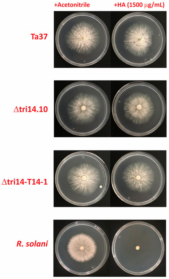 Initial analyses showing that tri14 is conserved in all trichothecene-producing fungi led to the hypothesis that the gene confers resistance/self-protection against the toxic effects of trichothecenes. Although the recent finding that Tri14 catalyzes the cyclization of isotrichodiol and isotrichotriol casts doubt on this hypothesis, we deemed it still worthwhile to test it. Therefore, we grew wild-type (Ta37), tri14 mutant (Δtri14.10) and tri14 add-back transformants of T. arundinaceum in the presence and absence of 1500 μg/mL HA. The results of this analysis revealed that HA did not cause growth inhibition in any of the strains examined (Figure 6). These results indicate that Tri14 does not impact the resistance of T. arundinaceum to HA under the conditions examined.