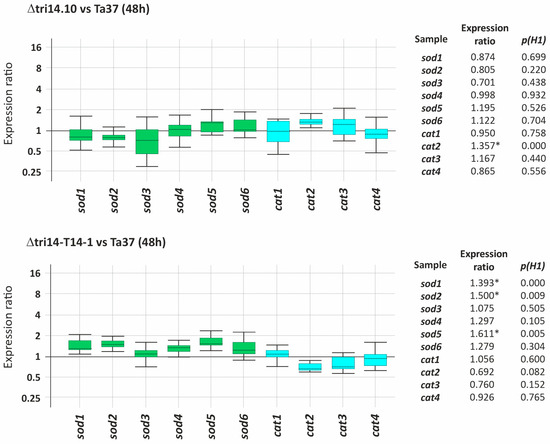 Effect of tri14 gene deletion on expression of T. arundinaceum genes related to ROS detoxification. qPCR Ct values and expression ratios were analyzed as described in the legend of Figure 4. Statistically significant values (p(H1) < 0.05) are indicated with an asterisk at the right panels.