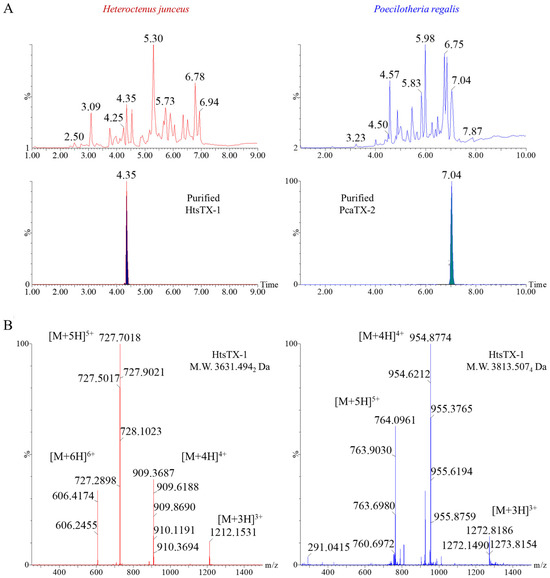 Representative TICs of Heteroctenus junceus and Poecilotheria regalis venom. A reversed-phase liquid chromatographic separation was performed for both H. junceus and P. regalis venom (see Methods 5.4). (A) A representative TIC for each whole venom (top) shows a complex mixture of small peptides and proteins. One toxin was purified from each venom (bottom) and were designated Heteroctenustoxin-1 (HtsTX-1) and Poecilotheriatoxin-2 (PcaTX-2). (B) A multiply charged electrospray spectrum with the [M + 5H]5+ and the [M + 4H]4+ ion clusters identified confirm that both HtsTX-1 and PcaTX-2 are compact peptides with molecular monoisotopic masses of 3631.4942 and 3813.5074 Da, respectively.