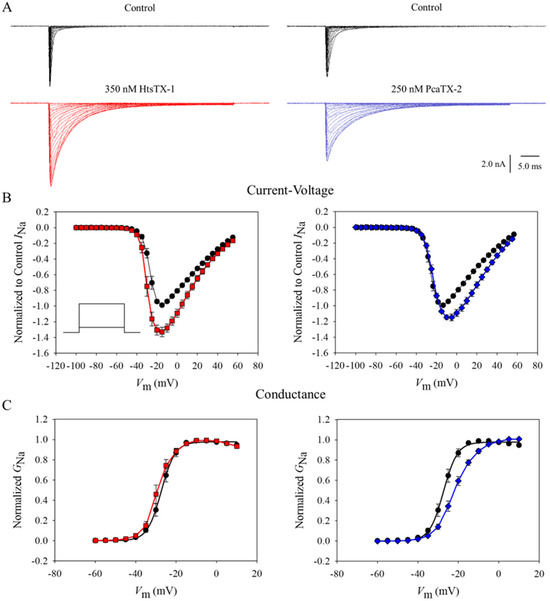 To further characterize the modulatory effects of HtsTX-1 and PcaTX-2 on the activation kinetics of Nav1.7, a normalized current–voltage (I/V) plot was generated and fitted (Figure 3B). Both curves showed a significant increase in peak current caused by the HtsTX-1 and PcaTX-2 of 39.6 ± 3% and 19.8 ± 2%, respectively. Our preliminary conclusions suggested the depolarizing shift in activation caused by PcaTX-2 is like that of PcaTX-1 and resulted in a small concomitant reduction in ion driving force [45]. The half-maximal voltage (I V½) was −32.42 ± 1.11 mV for the control; this did not significantly differ from −35.13 ± 1.21 mV after application of HtsTX-1 (Table 1). The half-maximal voltage (I V½) was −33.04 ± 0.95 mV for the control; this did not significantly differ from −30.43 ± 0.86 mV after application of PcaTX-2. The reversal potential (Vrev) of 61.1 ± 0.76 mV for the control did not significantly differ from 59.1 ± 0.62 after application of HtsTX-1 nor did the Vrev of 57.6 ± 1.08 significantly differ from 60.7 ± 1.19 after application of PcaTX-2. This observation suggested that the toxins do not modify the channel’s selectivity for sodium ions [51]. The voltage dependence of Nav1.7 activation was measured by plotting conductance–voltage (G/V) curves, which were then fitted by a Boltzmann distribution (Figure 3C). The half-maximal activation of current (G V½) before application was −26.75 ± 0.29 mV, which showed a small but significant negative shift to −29.35 ± 0.36 mV after application with HtsTX-1. The −21.62 ± 0.30 mV after application with PcaTX-2 significantly differs from G V½ before application of −27.35 ± 0.29 mV. There was no statistical difference in the slope factors (G k) before and after HtsTX-1 application; however, PcaTX-2 significantly altered the slope. Taken together, these data suggest that both HtsTX-1 and PcaTX-2 produce small changes in the voltage dependence of activation by shifting to slightly more negative potentials in the case of the former and positive potentials for the latter.