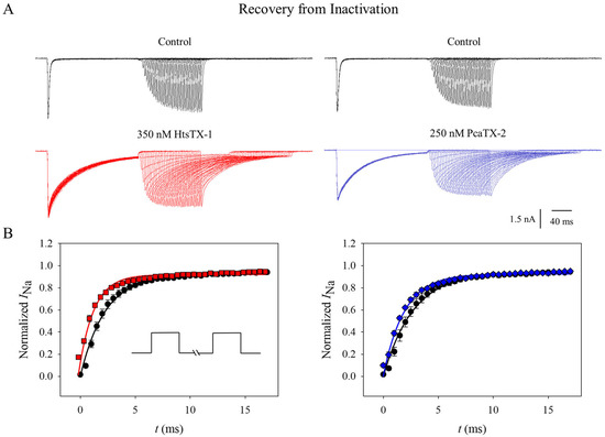 To further characterize the observed site 3 modulatory effects of HtsTX-1 and PcaTX-2, both steady-state fast and slow inactivation kinetics were investigated. The steady-state fast inactivation parameter (h∞)was measured using a standard two-pulse protocol. Starting at a VH of −120 mV, conditioning pre-pulses ranging from −140 to +10 mV in 5 mV steps for 50 ms were delivered, and currents were recorded during a 20 ms depolarization step to −20 mV before (black traces) and after perfusion of HtsTX-1 (red ■) and PcaTX-2 (blue ♦). The duration of the pre-pulse potential is 50 ms, and there is no hyperpolarizing gap or return to VH between the pre-pulse and test pulse. It has been documented that “with longer durations of pre-pulses in the steady-state fast inactivation protocol, the ratio of slow inactivated channels increases from ~5% (100 ms pre-pulse) to ~40% (2 s pre-pulse)” [52]. Representative current traces have been displayed to demonstrate their general effect on Nav1.7 steady-state fast inactivation (Figure 4A). Normalized sodium currents were plotted against the increase in the pre-pulse potentials and subsequently fitted with a Boltzmann distribution (Figure 4B). The voltage dependence of steady-state fast inactivation (h∞ V½) of −64.49 ± 0.85 mV before application did not significantly differ from −62.08 ± 0.67 mV after application of HtsTX-1. Similarly, the voltage dependence of h∞ V½ of −62.65 ± 1.27 mV before application did not significantly differ from −58.67 ± 1.32 mV after application of PcaTX-2. No statistical difference of the slope factors (h∞ k) was observed. Taken together, these data suggest that neither HtsTX-1 nor PcaTX-2 altered the kinetics of steady-state fast inactivation.