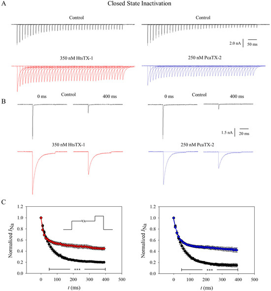 To examine the effect of toxin application on the closed-state inactivation of Nav1.7, a standard two-pulse protocol was used. Cells were kept at a holding potential of −120 mV and subjected to a conditioning depolarizing pulse to −60 mV from 0 to 390 ms (Δ 10 ms), followed by a 50 ms depolarizing pulse to 0 mV. Representative current traces are displayed to demonstrate their general effect on Nav1.7 closed-state inactivation (Figure 6A). Although the inhibition of CSI is visible in the summed traces before (black) and after application with 350 nM HtsTX-1 (red ■) and 250 nM PcaTX-2 (blue ♦), a first and last trace, i.e., a depolarizing step at 0 ms and 400 ms, respectively, are provided to further emphasize the effect observed (Figure 6B).