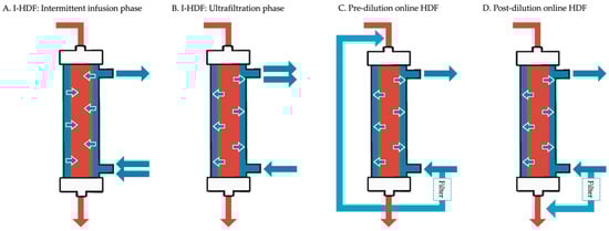 - Mineshima, M.; Takahashi, S.; Tomo, T.; Kawanishi, H.; Kawaguchi, H.; Minakuchi, J.; Nakanishi, T.; Sato, T.; Nitta, K.; Tsuchiya, K.; et al. A Clinical Significance of Intermittent Infusion Hemodiafiltration Using Backfiltration of Ultrapure Dialysis Fluid Compared to Hemodialysis: A Multicenter Randomized Controlled Crossover Trial. Blood Purif. 2019, 48, 368–381. [Google Scholar] [CrossRef]