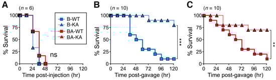 The intraperitoneal toxicity of rL-PTCs was assessed by intraperitoneal (i.p.) administration of 200 pg rL-PTCs to mice. L-PTCs absorbed from the intestines or injected into the bloodstream dissociate into BoNT and neurotoxin-associated proteins in the circulation [,]. In other words, intraperitoneal injection resulted in the toxicity of BoNT alone in the L-PTC complex. rL-PTC/B-WT, rL-PTC/B-KA, rL-PTC/BA-WT, and rL-PTC/BA-KA all harbored comparable amounts of native BoNT/B (Figure 2) and exhibited similar BoNT toxicity (Figure 5A), indicating that the oral toxicity depends on the intestinal absorption rather than intrinsic BoNT activity.