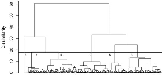 | Genus | Cluster 1 (%) (n = 138) | Cluster 2 (%) (n = 244) | Cluster 3 (%) (n = 252) | Cluster 4 (%) (n = 231) | Cluster 5 (%) (n = 132) | Cluster 6 1 (%) (n = 28) |