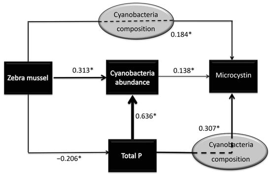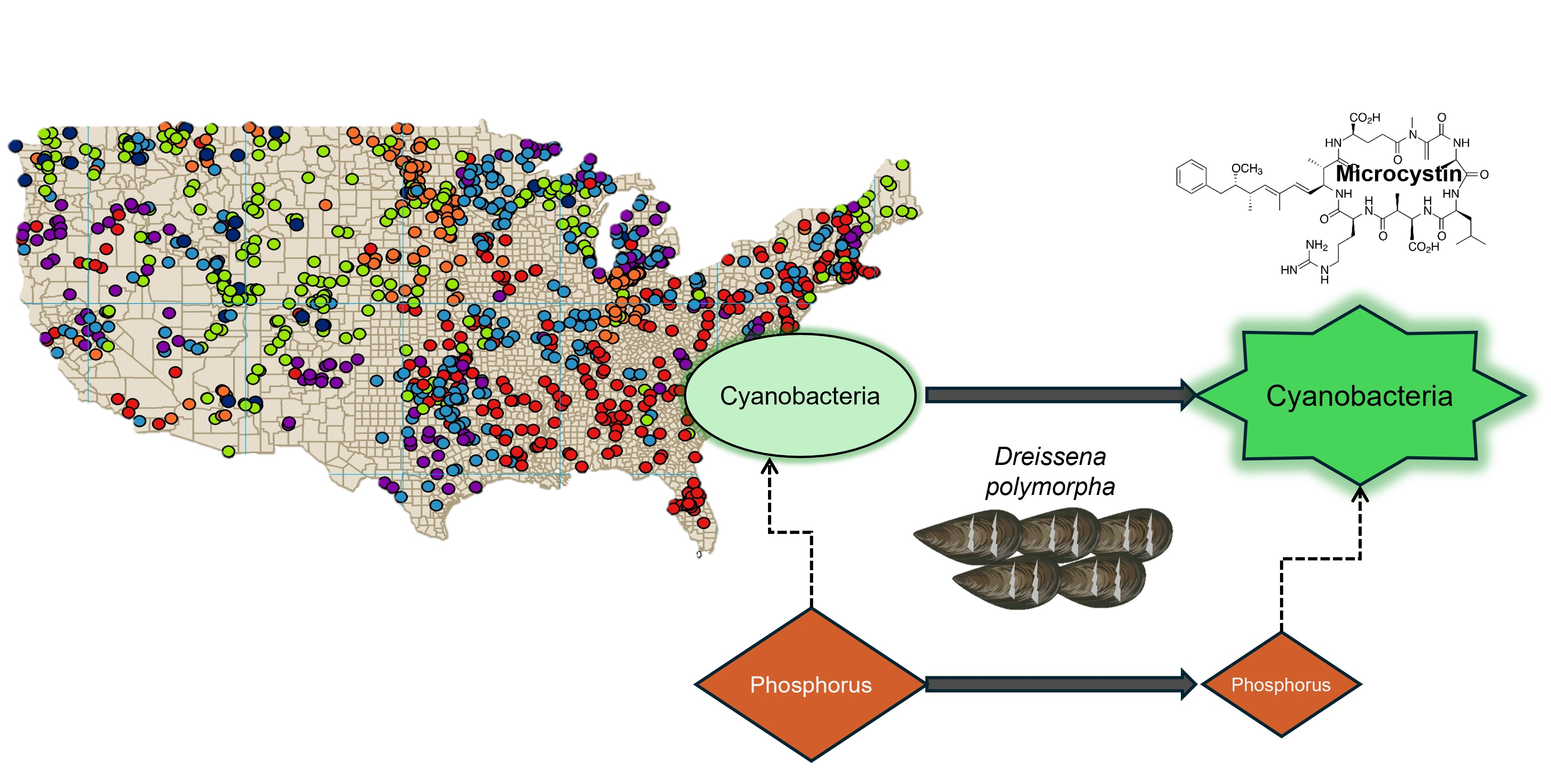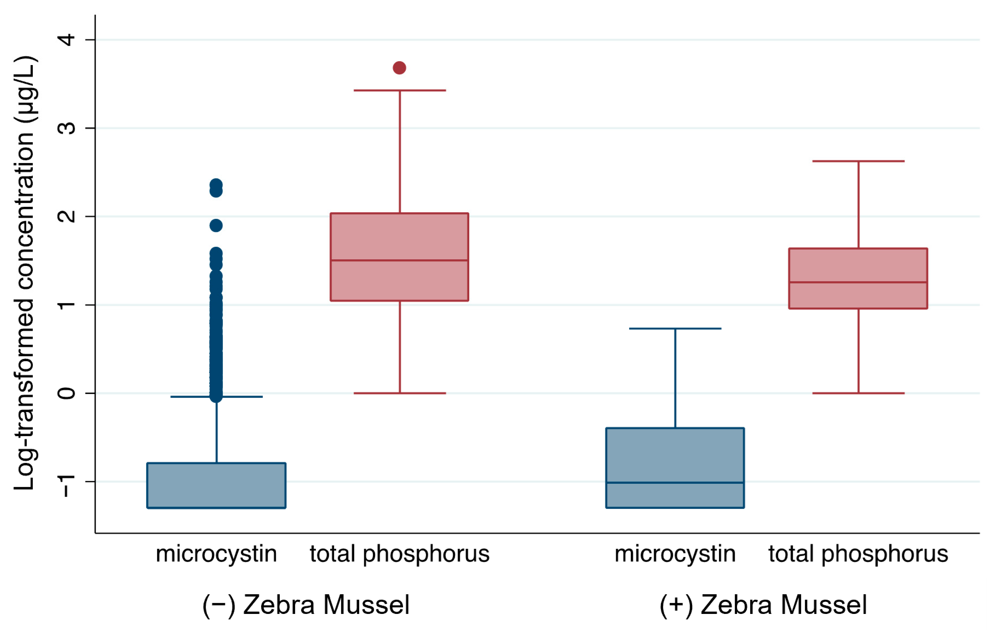 - There appeared to be a positive effect of zebra mussel establishment on microcystin occurrence, after controlling for total nitrogen and phosphorus levels. Alternatively, zebra mussel establishment can remove phosphorus and thereby suppress microcystin occurrence;
