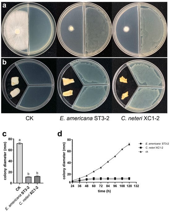 Effects of VOCs from E. americana and C. neteri on mycelial growth and tissue block morphology of P. pulmonarius. (a) Inhibition of P. pulmonarius mycelial growth by VOCs from two pathogenic strains after 120 h of co-culture; (b) Effect of VOCs from two pathogenic strains on P. pulmonarius tissue blocks after 72 h of exposure; (c) Colony diameters of P. pulmonarius after 120 h of exposure to VOCs. Different letters (a, b) above the bars indicate significant differences (p < 0.05).; (d) Mycelial growth curve of P. pulmonarius under VOCs exposure from 24 to 120 h.